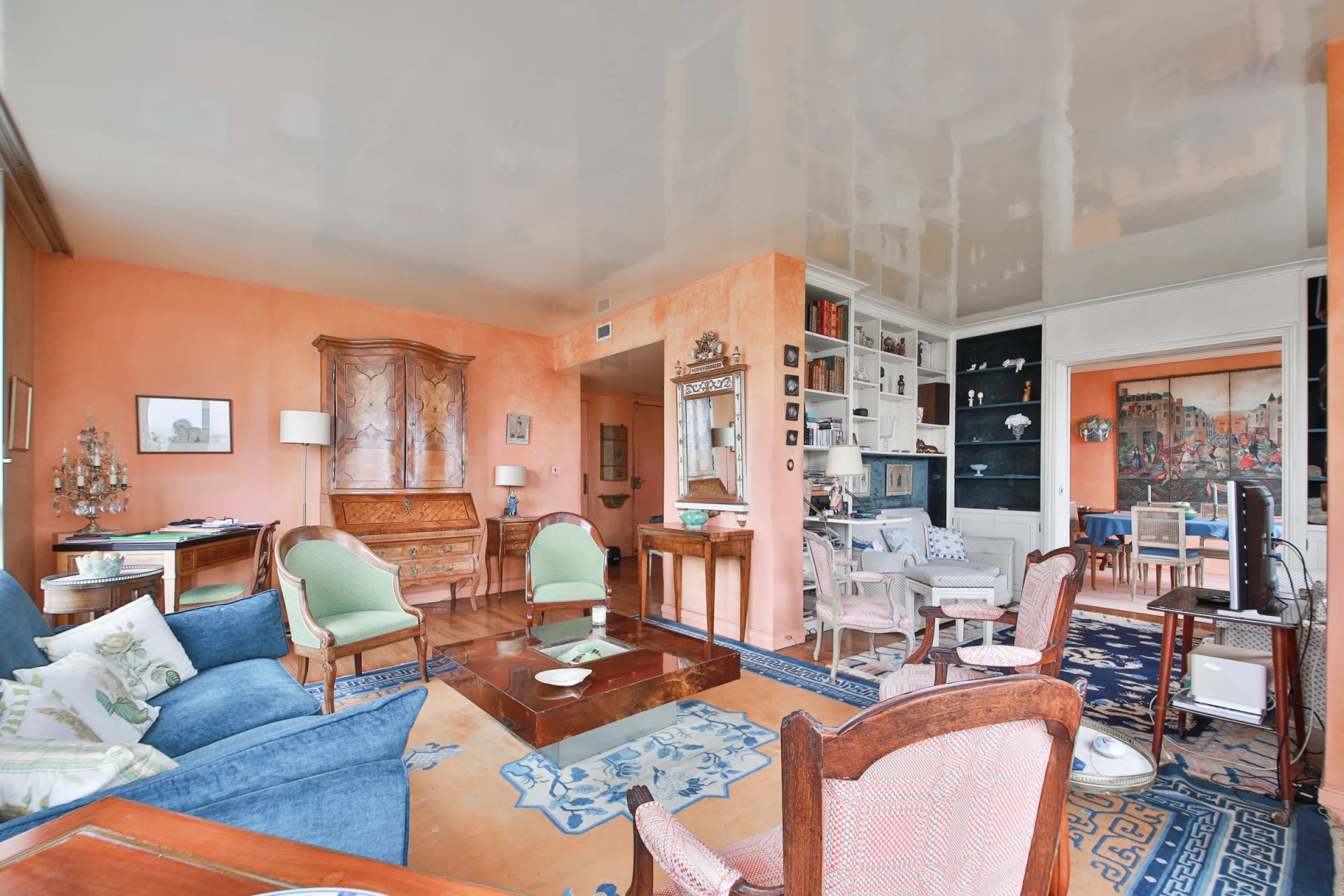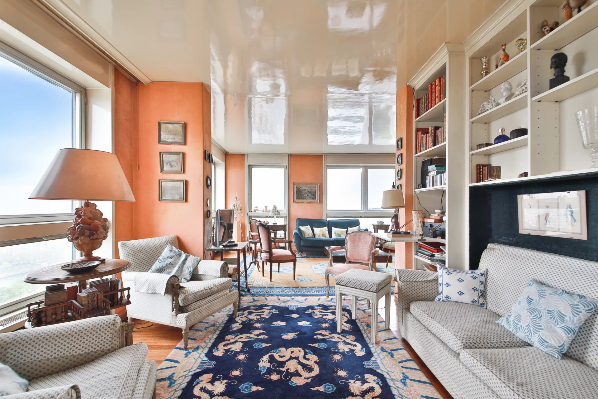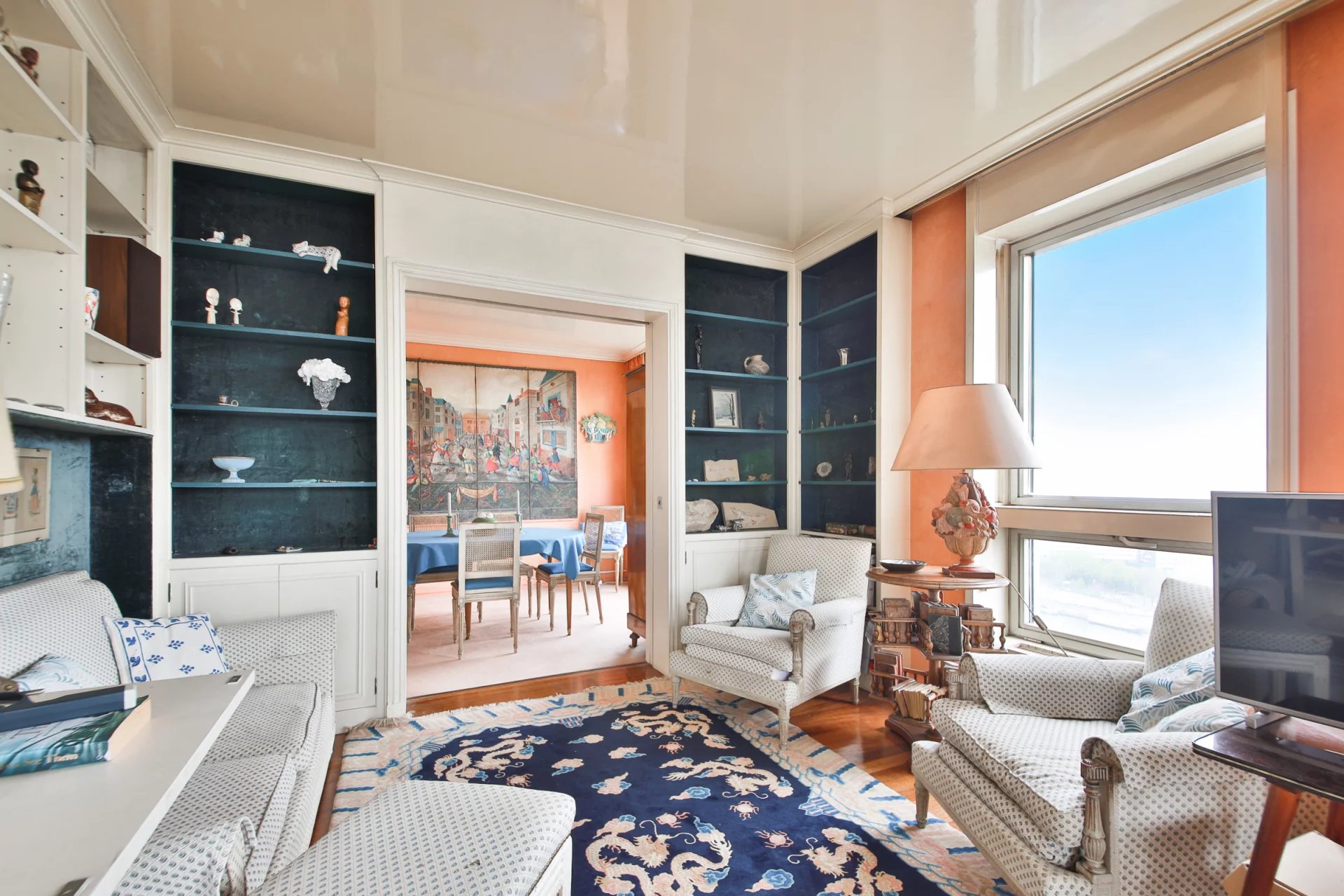 Tour du Front de Seine en étage élevé avec vue exceptionnelle sur la Tour Eiffel et la Seine, nous vous proposons un ensemble rare et modulable : un appartement familial de 115 m² auquel est attenant une studette de 17 m², offrant une surface totale de 132 m².