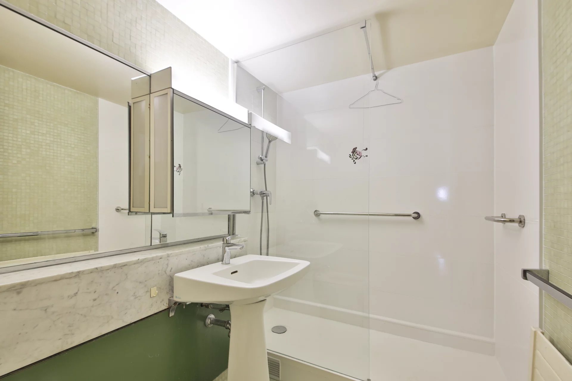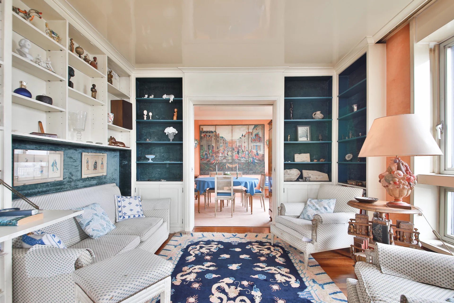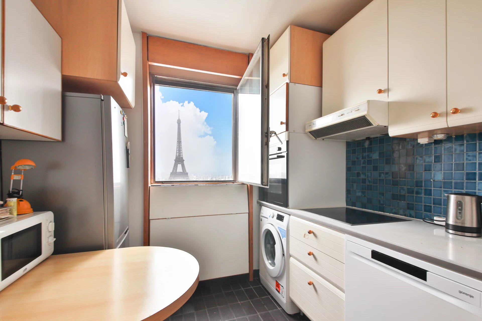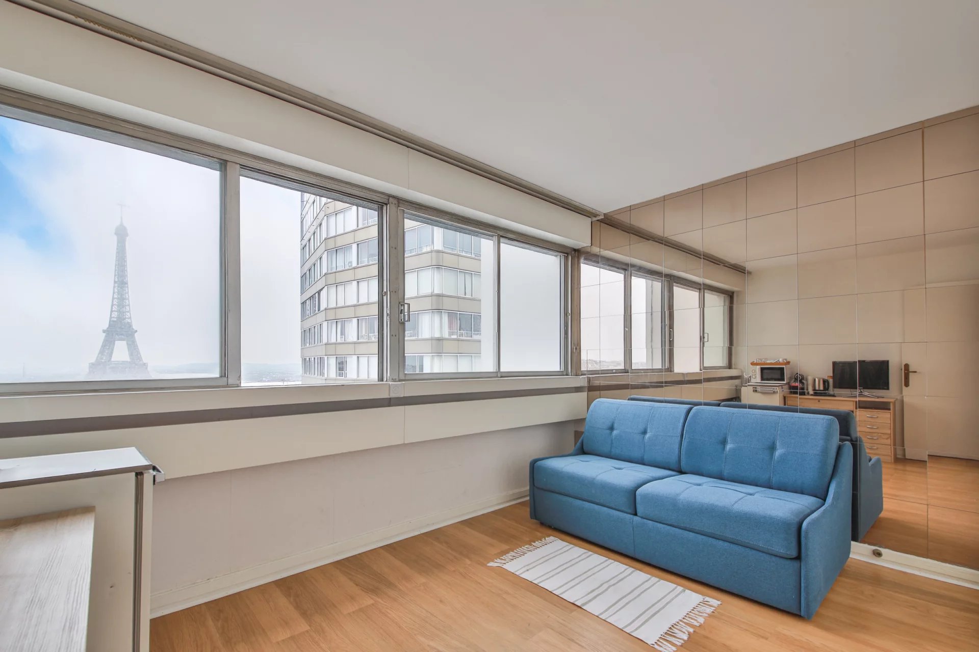 La studette, également orientée Tour Eiffel, offre une double opportunité : intégrée à l'appartement pour former un ensemble de 132 m², ou exploitée de manière indépendante — sa valeur locative est estimée à 900 €/mois.